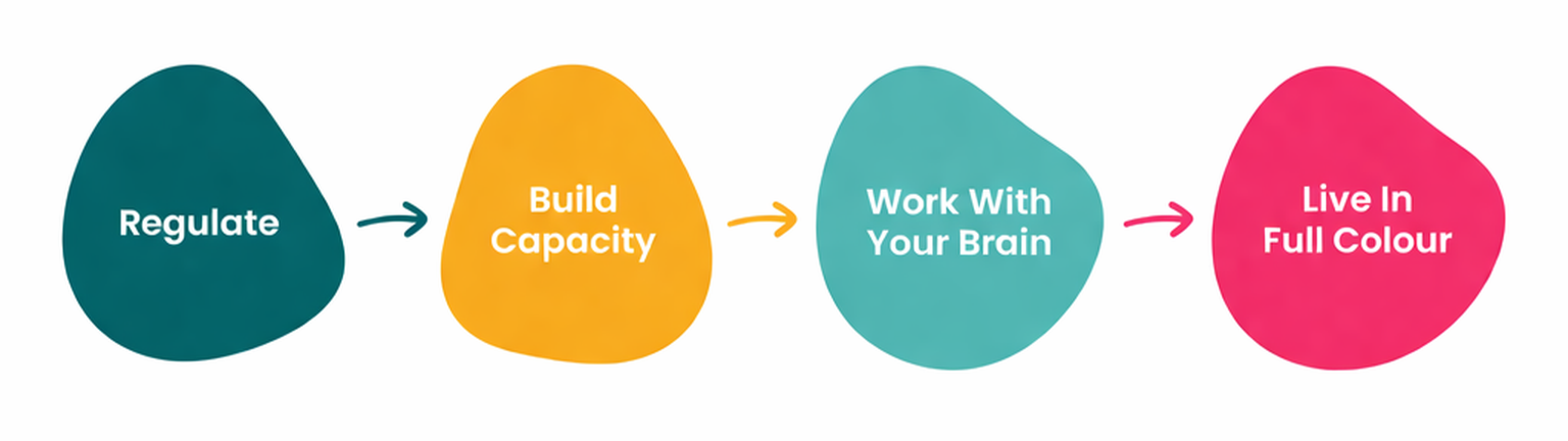 It’s a somatic, full body experience, inviting you to process what’s happening in your body, while your thoughts take a back seat. Over time, this builds your ability to recognise bodily signals, develop healthier responses and support your needs from the ground up.